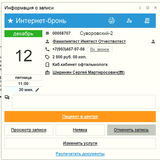 В МИС 1С: МедАнгел до подтверждения записи пациентом на синем поле будет написано «Интернет-бронь».