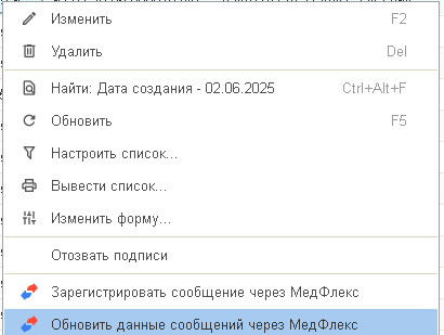 - Кликнуть правой кнопкой мыши, и нажмите «Обновить данные сообщений через МедФлекс».