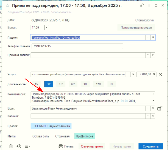 В МИС 1С: Стоматологическая клиника у подтвержденной записи статус записи в МИС меняется на «Подтверждено» и в комментарий добавляется об этом запись.