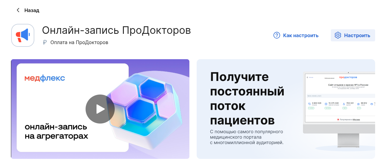 Страница сервиса находится в личном кабинете МедФлекса в «Магазине интеграций» и на лендинге https://medflex.ru/clinics/: