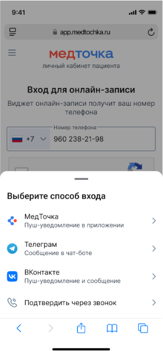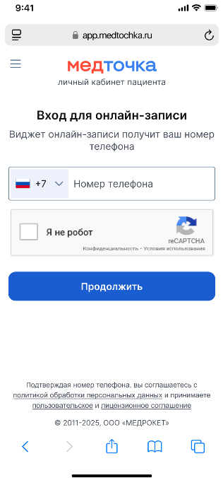 Авторизация пациентов при онлайн-записи через виджеты МедФлекса происходит через сервис МедТочка. Страница авторизация откроется в новом окне