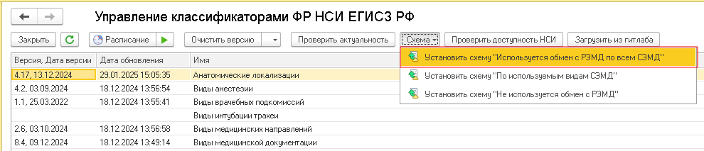 4. Для работы с РЭМД включите схему обновления «Используется обмен с РЭМД со всем СЭМД».