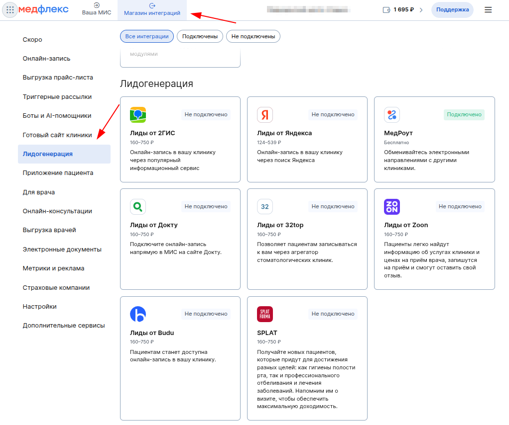 1) В личном кабинете МедФлекса перейдите в Магазин интеграций и выберите раздел «Лидогенерация»