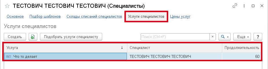 Услуги заполняются в карточке справочника «Специалисты» в разделе «Услуги специалистов».