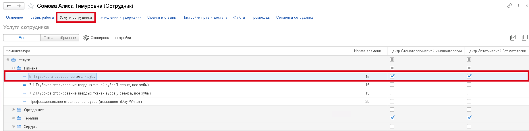 должна быть выставлена необходимая услуга справочника Номенклатура