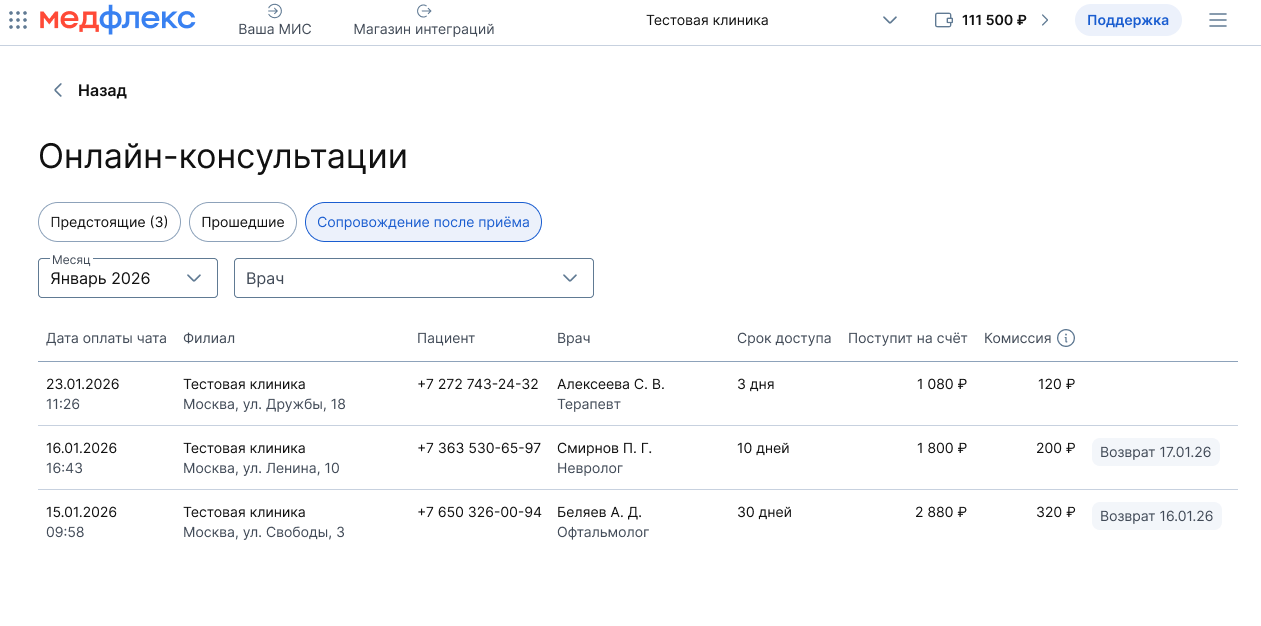 После включения интеграции у пациентов появится возможность получить консультацию от врача после очного приёма или онлайн-консультации без повторной записи на приём.