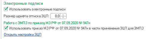 1. «Администрирование» → «Учетная политика» → раздел «Прочее», установить галочки напротив «Использовать электронные подписи» и «Использовать приказ МЗ РФ...».