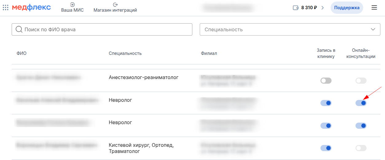Проверить, отображаются или нет онлайн-консультации у врача в виджете, можно в настройках виджета. Там же можно отключить запись на онлайн-консультацию для отдельных врачей: