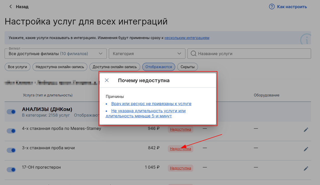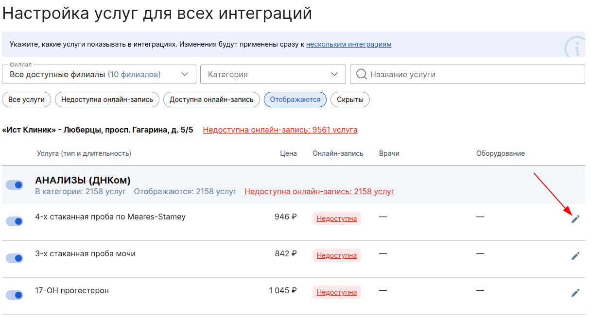 Кнопки «Все услуги», «Недоступна онлайн-запись», «Доступна онлайн-запись», «Отображаются», «Скрыты» будут показывать только категории и услуги, отвечающие выбранным фильтрам.