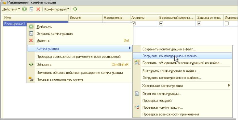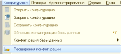 - Установка расширения происходит путем добавления через специальный раздел в Конфигураторе. Для этого необходимо открыть «Конфигурация» и выбрать «Расширения конфигурации».