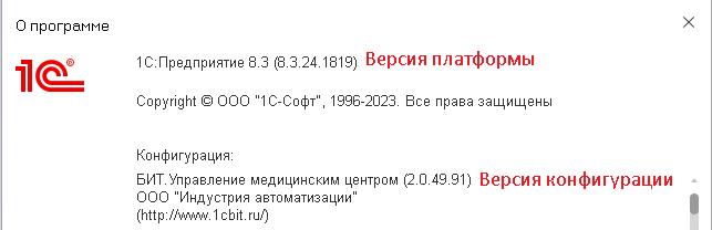 - Убедитесь, что версия платформы не ниже 8.3.22, а версия конфигурации не ниже 2.0.49.49. Если версии старше, обновите их.