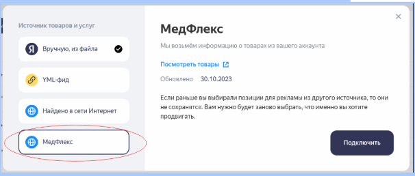 Важно! В личном кабинете Яндекс Бизнес надо выбрать МедФлекс в качестве источника выгрузки цен. Инструкция от Яндекса Как выбрать источник загрузки прайс‑листа.