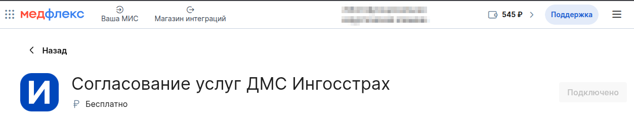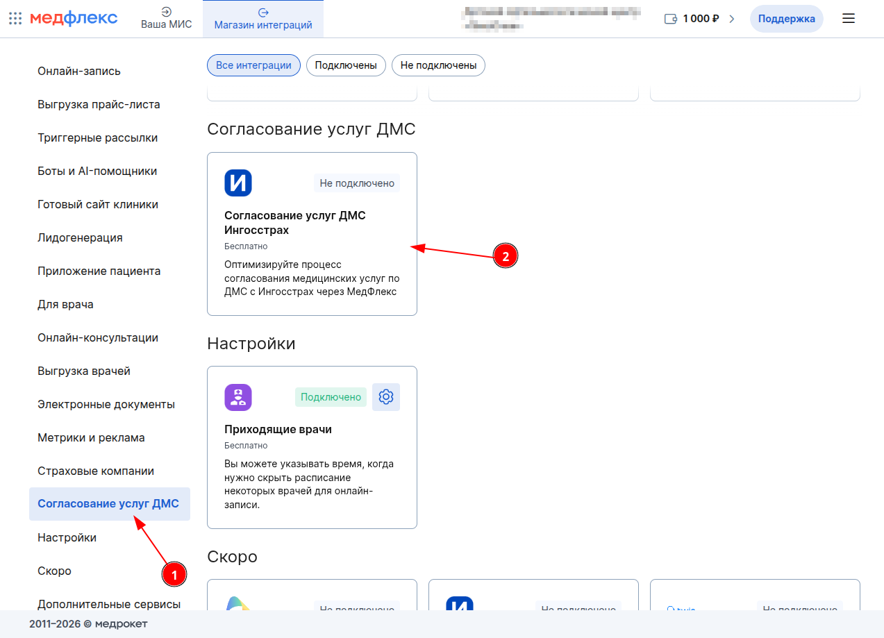 3) В меню категорий выберите "Согласование услуг ДМС" и нажмите на интеграцию с той страховой компанией, которую хотите включить.