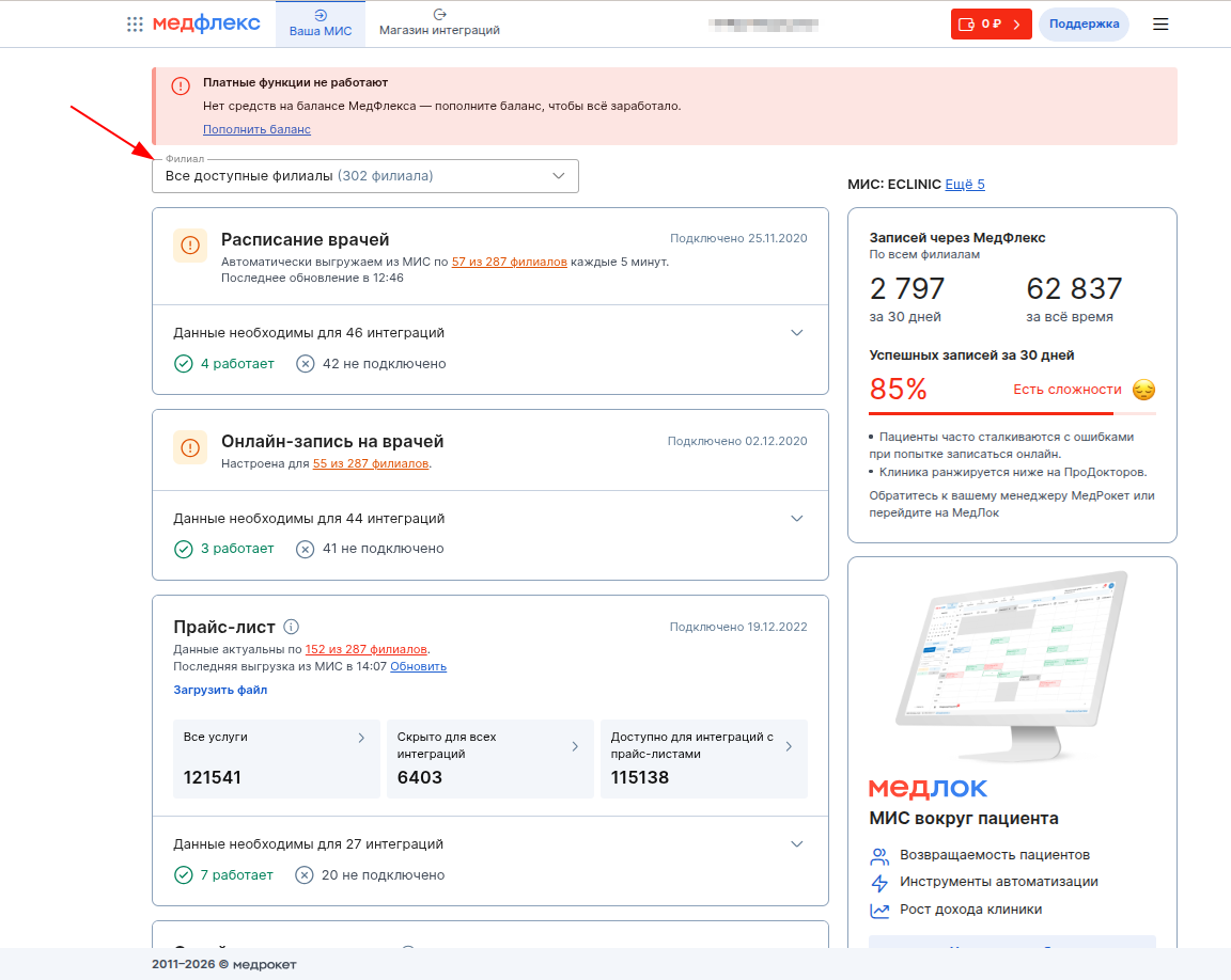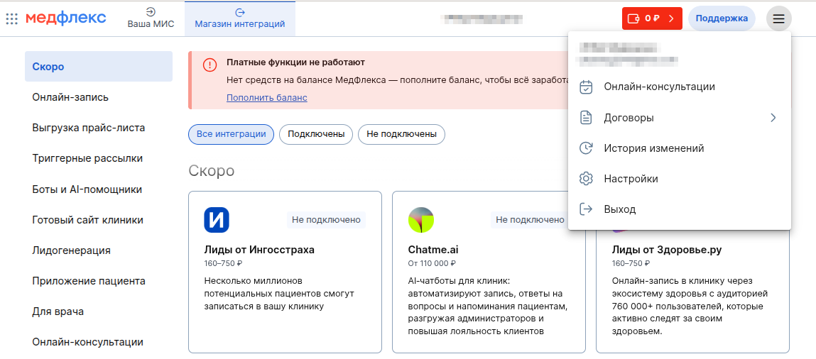 Если на вашем счёте МедФлекс низкий баланс, вы увидите баннер с уведомлением об этом в двух местах: на главной странице личного кабинета МедФлекс и на странице магазина интеграций.