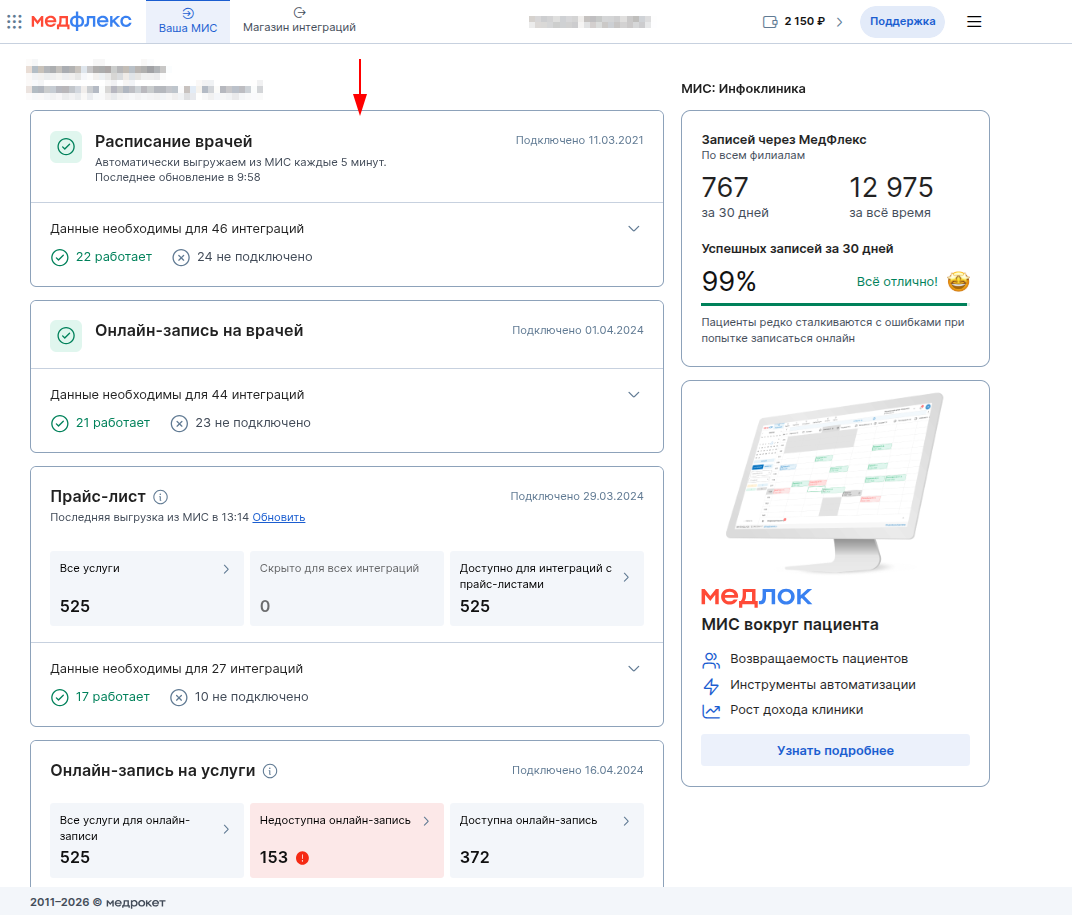 Наглядная статистика по онлайн-записям через МедФлекс находятся в блоке справа.
