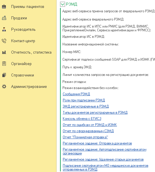 Заполнить настройки можно через обработку: «Главное» → в разделе «Сервис» → «Заполнение настроек интеграции с ЕГИСЗ - МедФлекс».