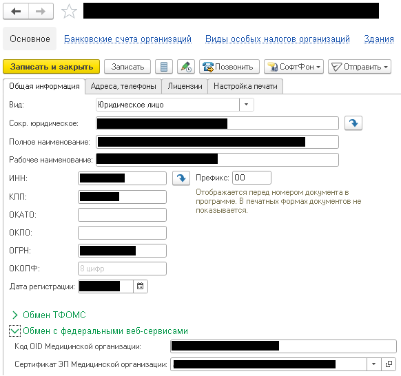 Указать OID организации: «Справочники» → раздел «Организационная структура» ⮕ «Организации» ⮕ открыть карточку необходимой организации ⮕ раскрывающийся список «Обмен с федеральными веб-сервисами» ⮕ «Код OID Медицинской организации».