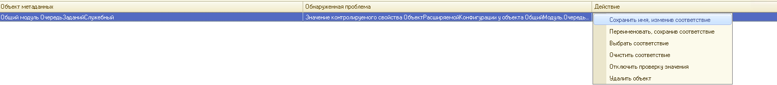 При установке расширения МедФлекс на более новые версии конфигурации (начиная с 3.0.17.7) может возникнуть ошибка «Значение контролируемого свойства ОбъектРасширяемойКонфигурации у объекта ОбщийМодуль.ОчередьЗаданийСлужебный не совпадает со значением в расширяемой конфигурации». В таком случае необходимо справа нажать на кнопку «Исправить» и выбрать «Сохранить имя, изменив соответствие», после чего применить изменения конфигурации.
