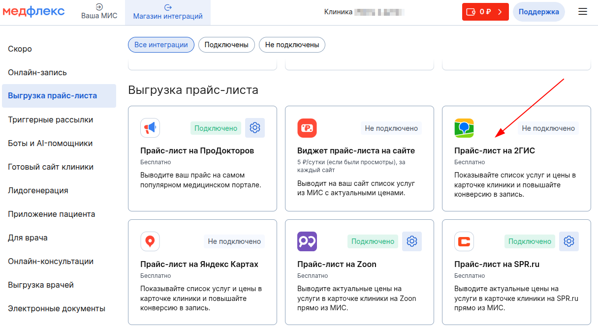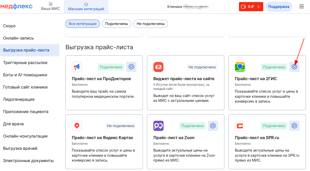Как завести личный кабинет на ПроДокторов читайте в статье - Как зарегистрировать клинику на портале. - Выберите «Прайс-лист на 2ГИС» в блоке «Выгрузка цен» и нажмите на интеграцию.