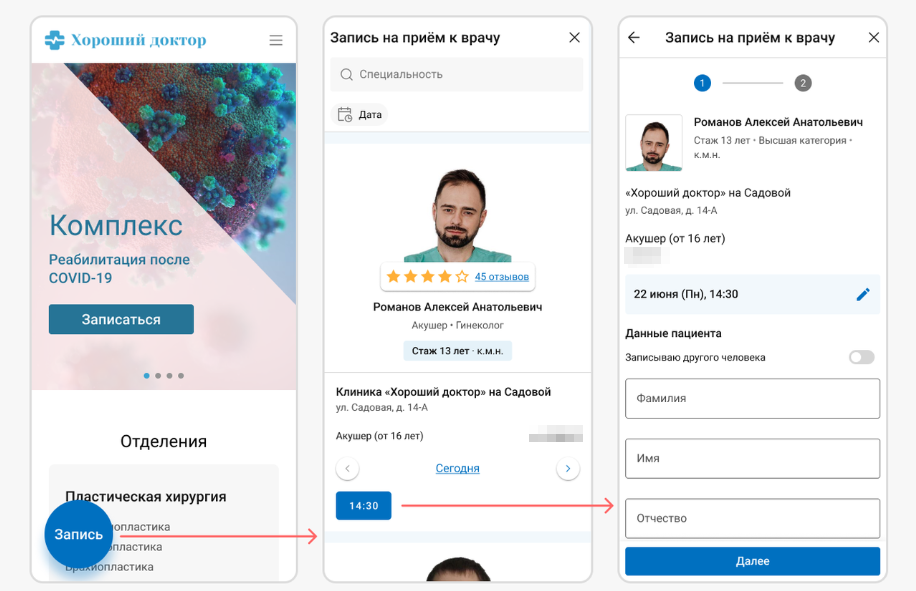 Сайттағы онлайн жазу түймесі. Орнатқаннан және орнатқаннан кейін пациенттер дәрігерлердің кестесін қарап, ыңғайлы уақытқа жазыла алады. Жазбалар тікелей mis-ке түседі.