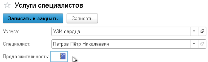 - Если продолжительность указана в карточке номенклатуры (не равно 0), при этом время этой услуги в настройках врача меньше (настройки по сотруднику), то длительность берется из самой карточки