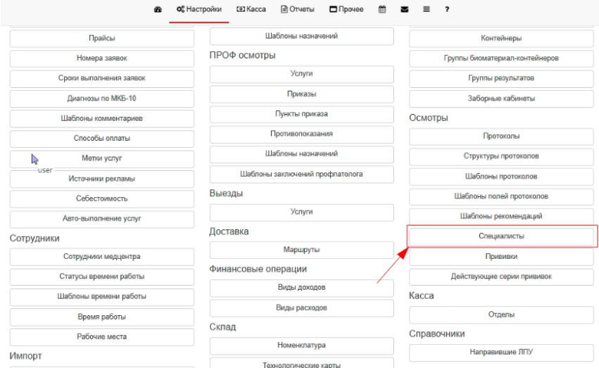- В поле «Пользователь» выберите всех врачей, которые будут оказывать услуги, относящиеся к этой специальности.