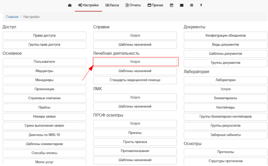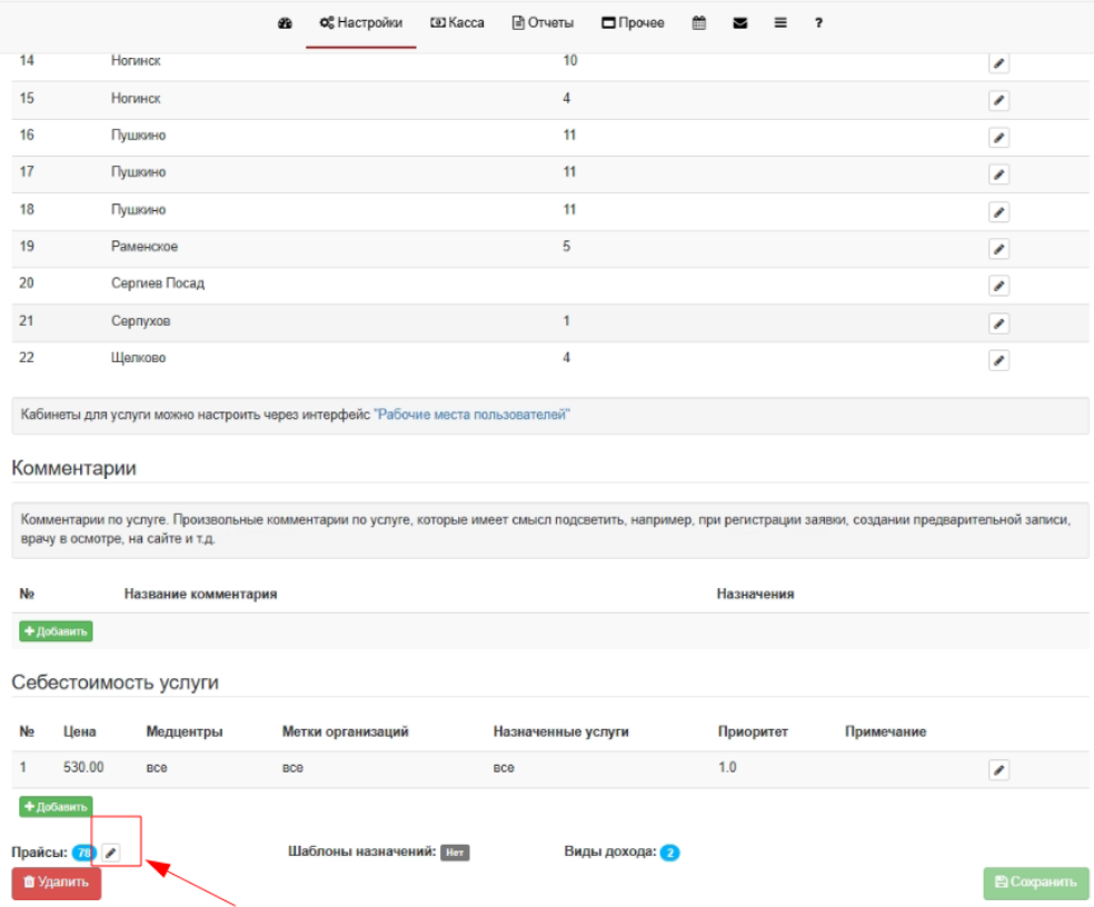 5. Перейдите в «Настройки» и выберите «Услуги». Перейдите к редактированию услуги, для которой необходимо указать стоимость нажав на кнопку редактирования, отмеченную на рисунке ниже.