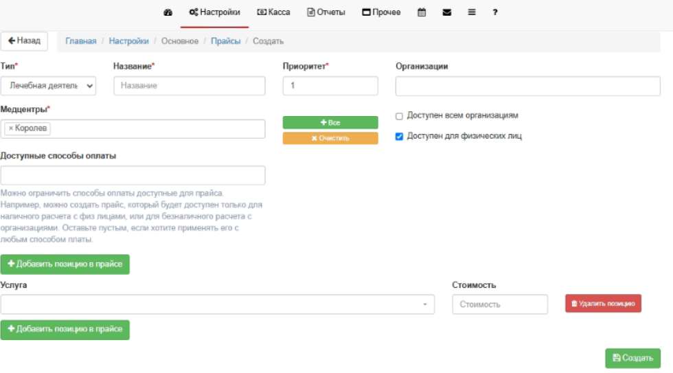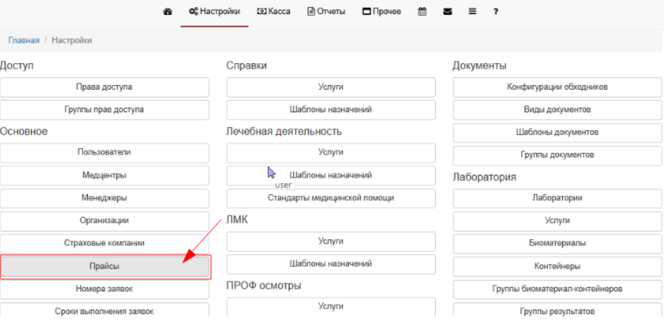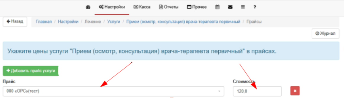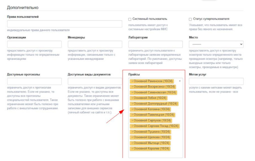 8. В поле «Прайсы» укажите прейскуранты, которые будут выгружаться на портал ПроДокторов.