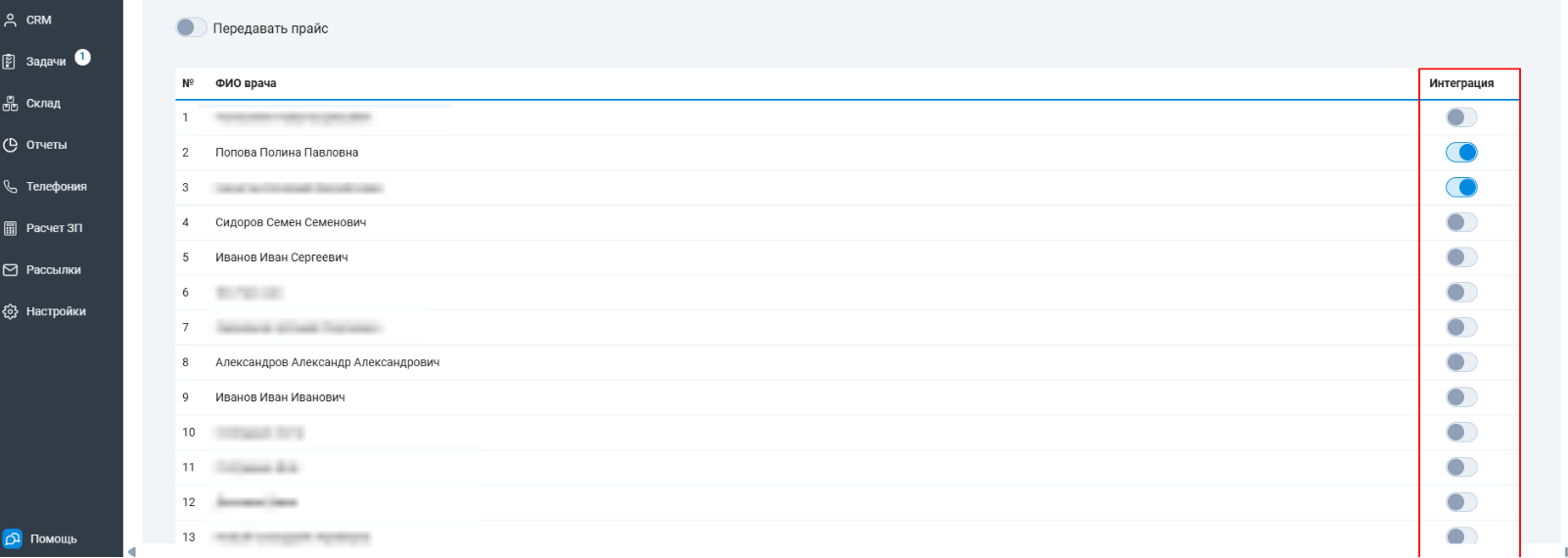 2. Проверьте, что включены тумблеры "Передавать прайс" и "Интеграция" для необходимых врачей.