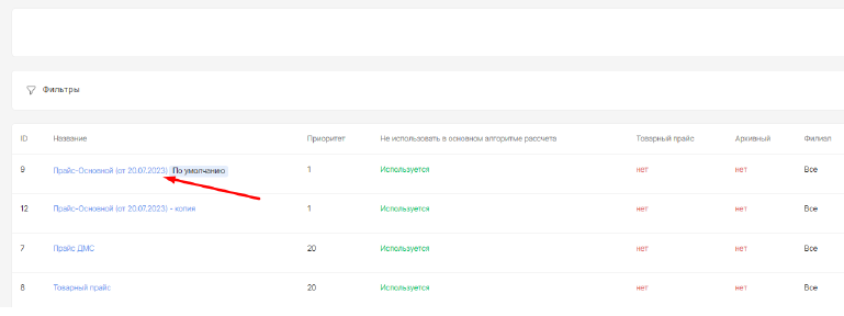 3. Нажмите на название прайс-листа, в котором находится нужная услуга.