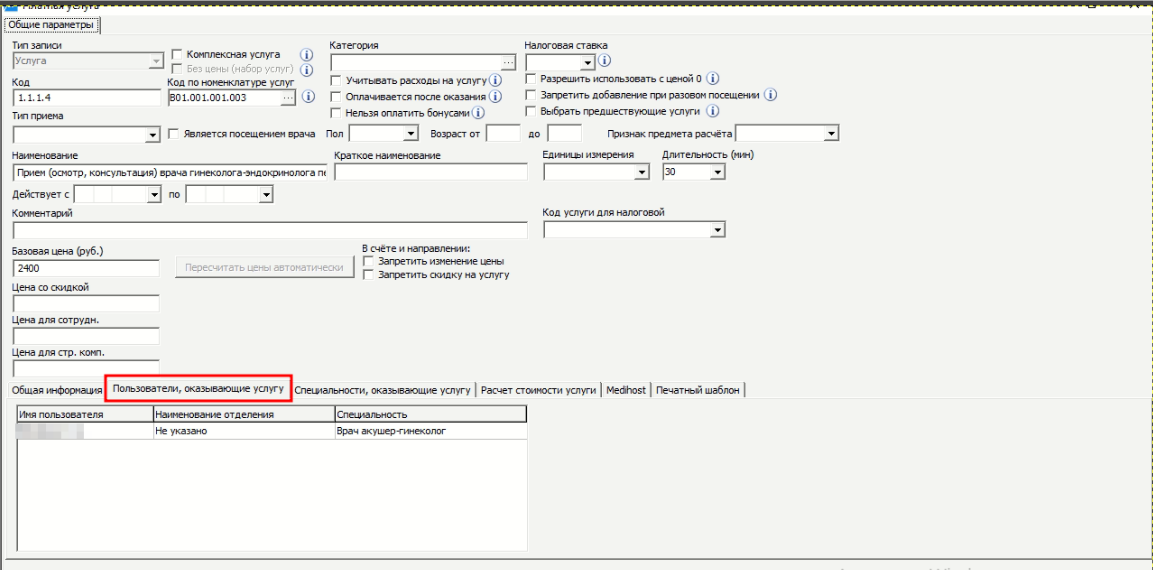 5. В этом же окне находится вкладка «Пользователи, оказывающие услугу» откройте её и укажите врачей которые оказывают данную услугу.