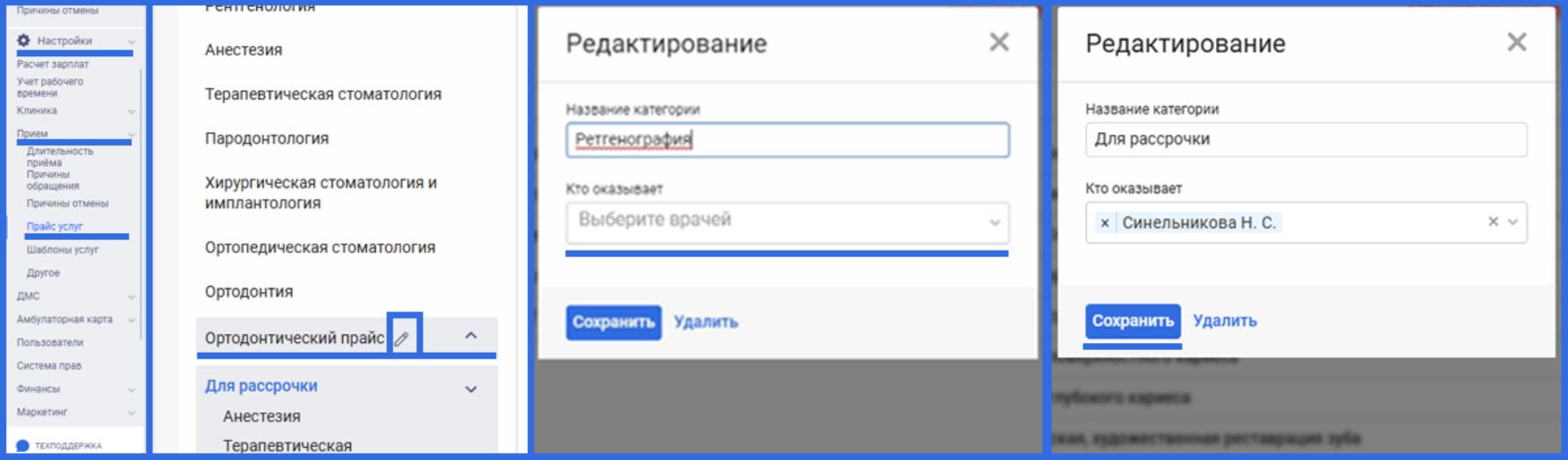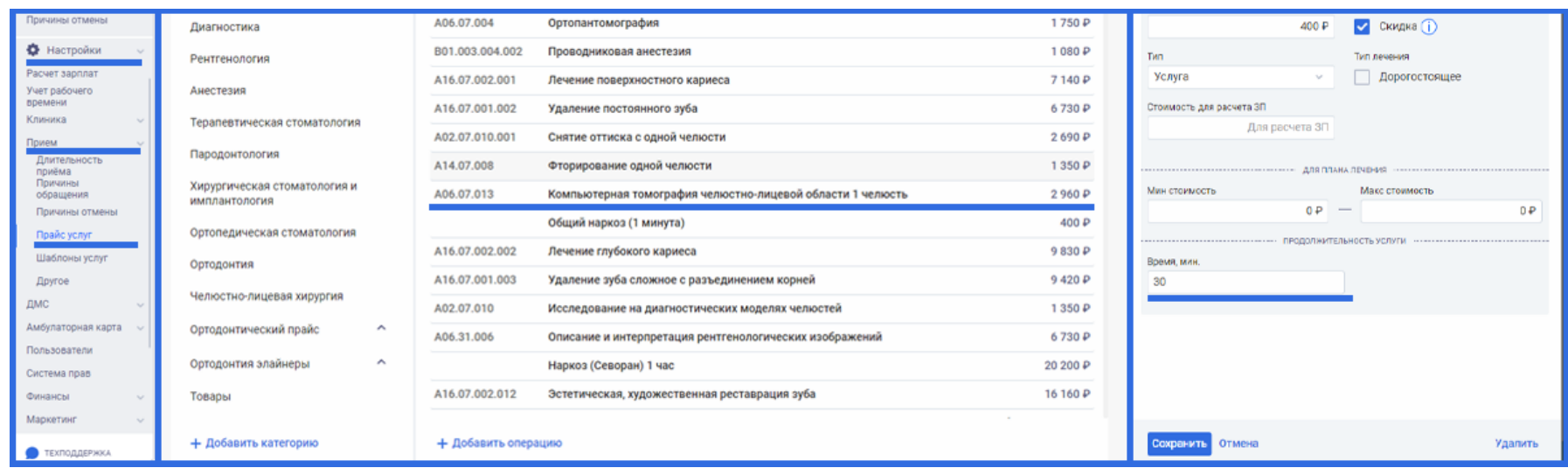 1. Перейдите в раздел «Настроки» выберите «Прием» и нажмите «Прайс услуг». Выберите нужную услугу и у вас откроется окно редактирования.
