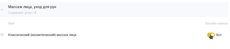 2. Найдите необходимую услугу и активируйте переключатель «Онлайн-запись».