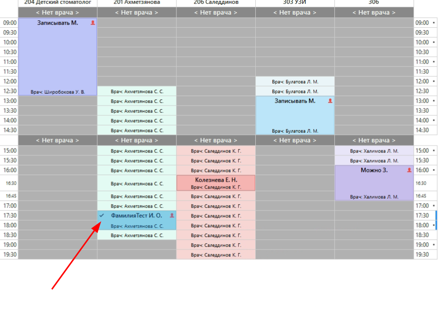 У неподтвержденной записи рядом с ФИО пациента нет галочки, также в модальном окне нет информации о подтверждении.