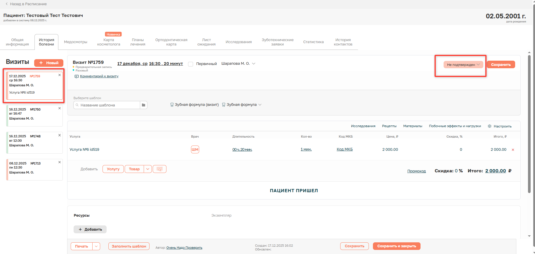 В МИС Аринка, Дента, 1dentа, Klinikon у неподтверждённой записи в расписании и при открытии детальной информации справа отображен статус «Не подтвержден» и подсвечен красным цветом.