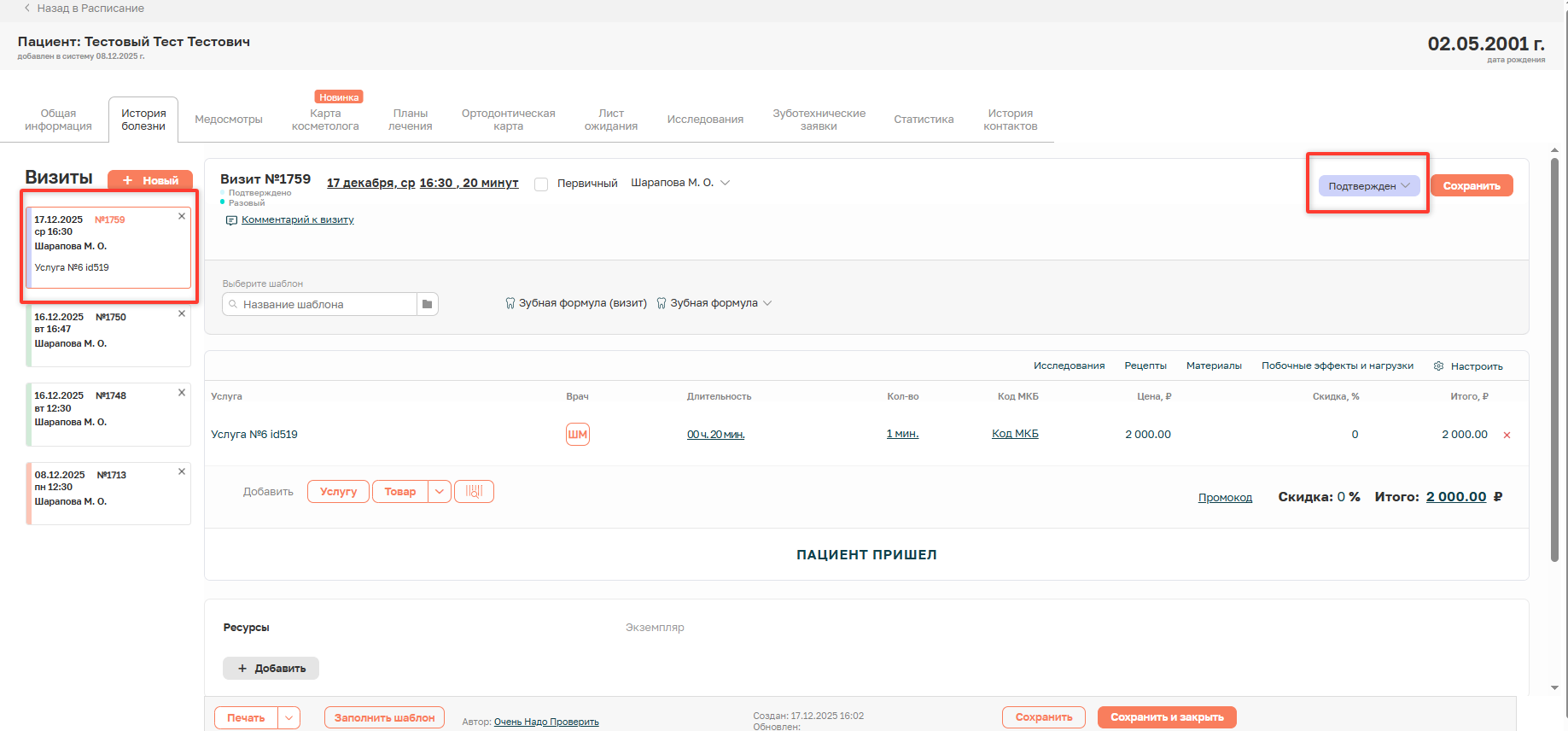 У подтверждённой записи в расписании и при открытии детальной информации статус изменен на «Подтвержден» и подсвечен синим цветом.
