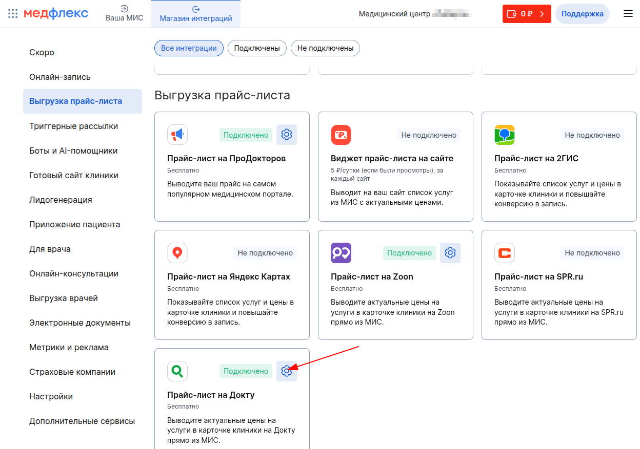 - Войдите в личный кабинет МедФлекс используя логин и пароль от личного кабинета ПроДокторов и перейдите в «Магазин интеграций».