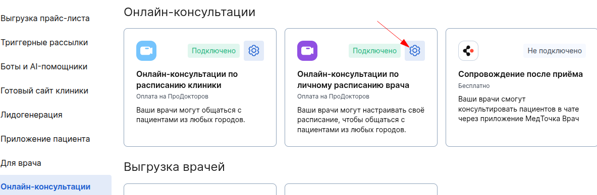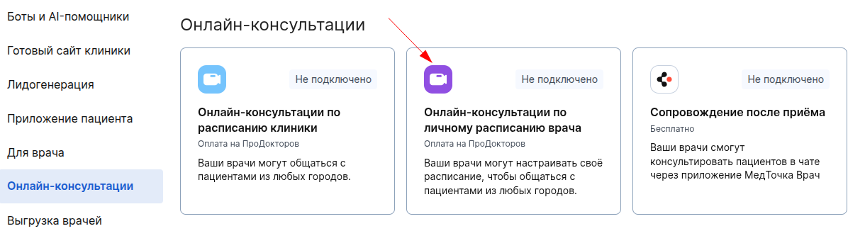 2. Во вкладке «Онлайн-консультации» выберите «Онлайн-консультации по расписанию врача» и нажмите на интеграцию.