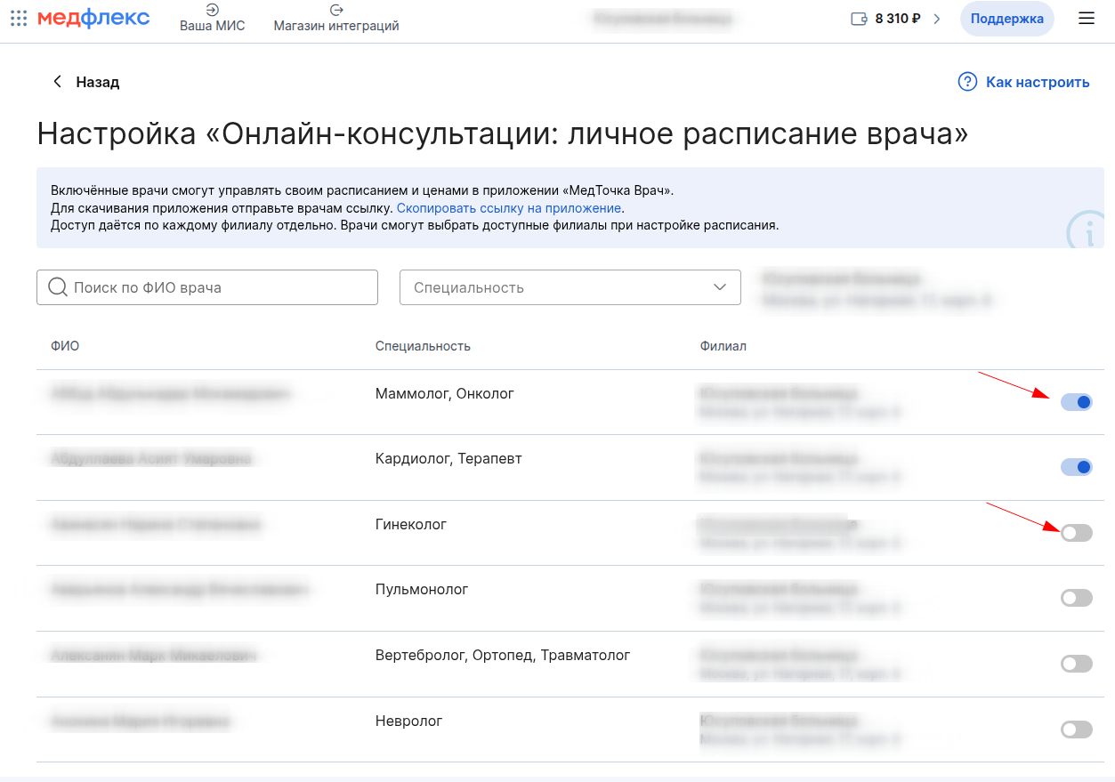 2. Включите настройку личного расписания нужным врачам.