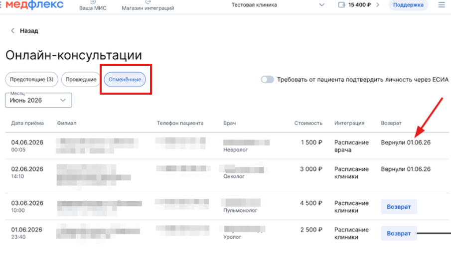Если вы решили вернуть деньги по договорённости с пациентом, возврат доступен в личном кабинете МедФлекса.